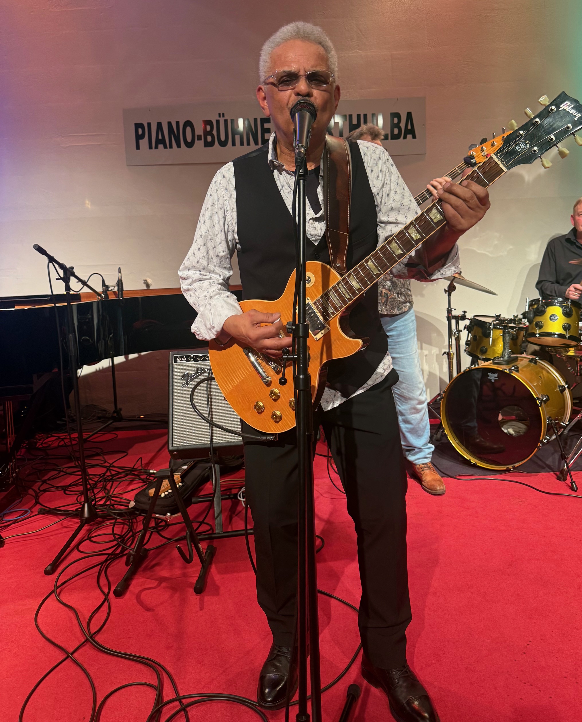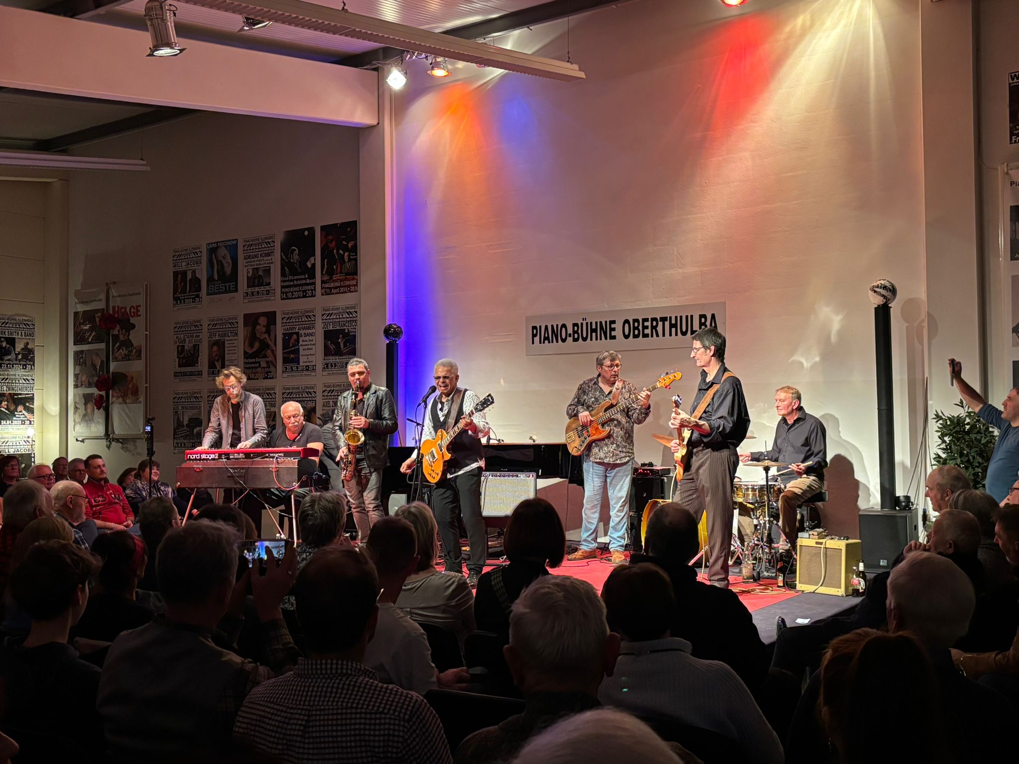 Im zweiten Set wurde dann die coolen Titel „Dont change your mind, Society Woman, Not fool no moe, Tribute to Oscar und going home” gespielt.Hier glänzte die präzise arbeitende Rhthmuygruppe mit dem groovenden Uli Lehmann am Bass und Bodo Matzkeit am Schlagzeug. Ständige Wechsel zwischen andächtigem Slow-Blues und temperamentvollem Funky-Blues honorierten alle Fans mit intensivem, , lang anhaltendem Applaus. Genial am Fender , am Steinway B und am Nord-Piano begeisterte Matthias Bublath. Herrliche Piano und Hammond Solis sowie einfühlsame (Cover Girl)und genau abgestimmte Hintergrundbegleitung, bei den Gesangsteilen von Al Jones ,teilweise an allen drei Instrumenten gleichzeitig, dominierten den Abend. Die Jam Einlage , „Every day we ave he blues“ in G spielten dann zusammen mit der Band, das Sax-Ass Vladi Strecker, Joe Dietz am Flügel und Peter Kleinhenz am Fender! Danach erklatschte sich das „ unnachgiebige“ Publikum der Band, noch 3 Zugaben. Cool down am Barflügel mit Jo Dietz, Vladi Strecker, Saxophon, Pizzi ‚Gutmann Querflöte und Boogie Woogie-man Lutz König beendeten dann einen tollen Konzertabend. Das nächste Konzert findet am Samstag 07.03.2025 mit Will Jacobs (USA)& internationale Blues-Band auf der Piano-Bühne statt!